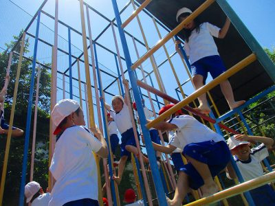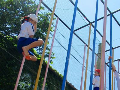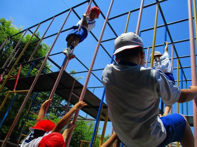スピード対決のゴールは、雲梯(うんてい)真ん中の高いところ。