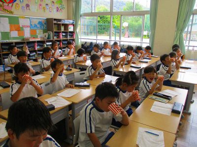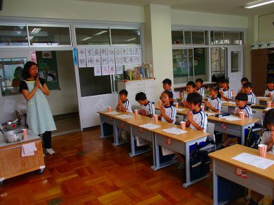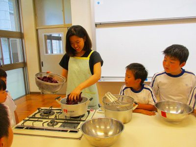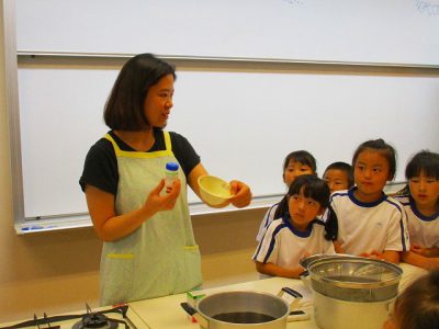 このあと、給食の居相先生が葉を水洗いし、茹でる作業をして下さいます。近くでそのようすを見学するため、算数は家庭科室の隣、「和の部屋」で行いました。