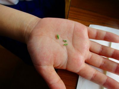 「手にとってその実を押さえると…「プチッ」と2つに分かれます!」と女子。