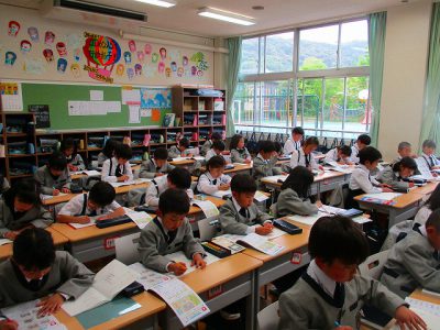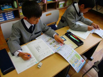 午後1時35分になると、もう静かに机に向かい、課題に取り組む2年生です。