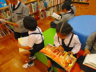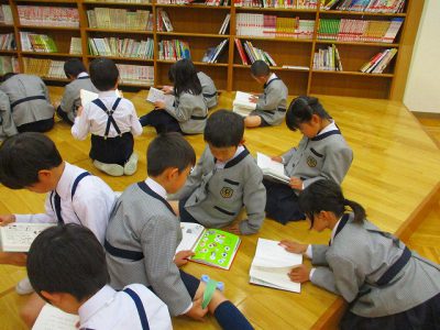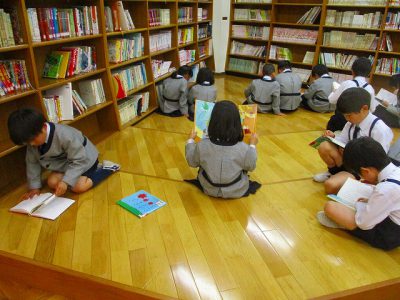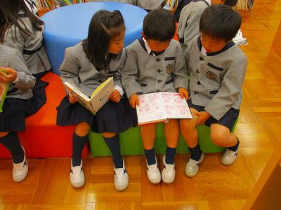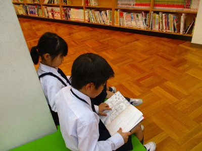 貸し出しを済ませた子は、借りた本とは別に書架の本を手に取り、思い思いの場所で読書のひとときを過ごします。