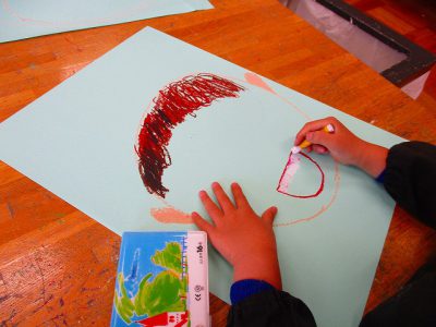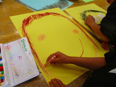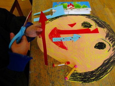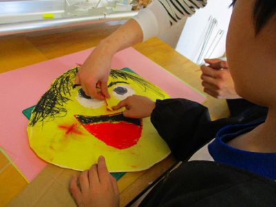 画面いっぱいに大きな顔を描いて“自分時計”の製作が始まりました。