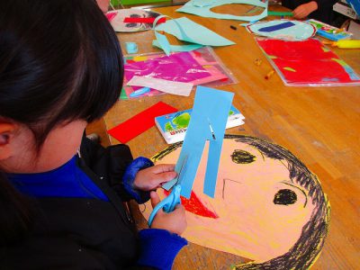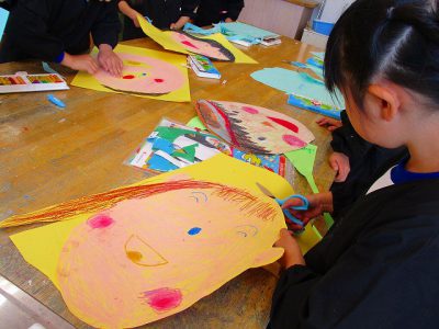 ダイナミックな顔が描けたら、はさみで周りを切り取ります。そして……