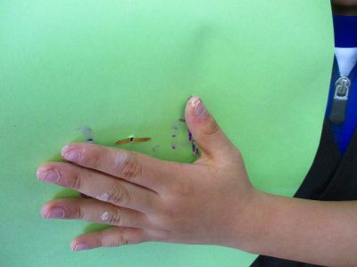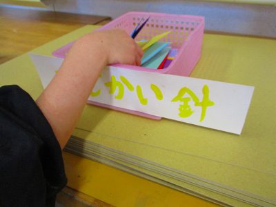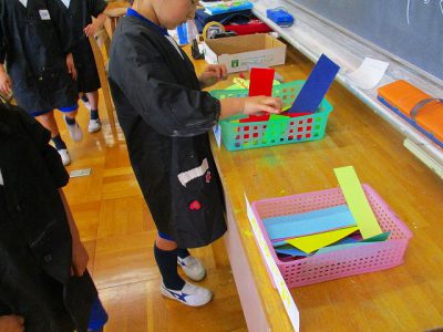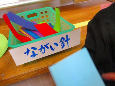 長針用と短針用の紙をもらって、自分だけの時計針を描きます。