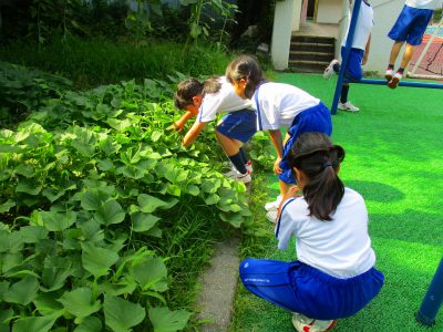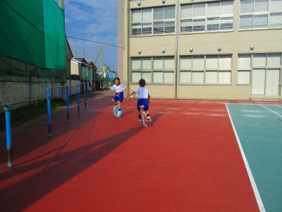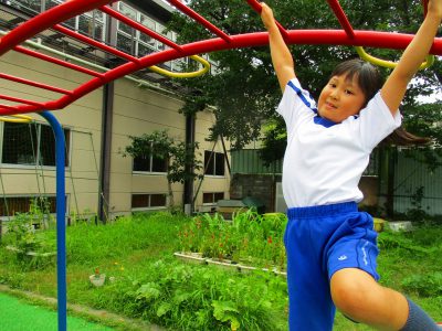 まだ、すいている(!?)グラウンドで、一輪車にうんてい、鬼ごっこを始めています。日直さんが畑のサツマイモをチェックして、水やりが必要かを確かめてくれていました。