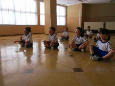 毎週金曜朝の英語ラジオ体操中!ヨガでリラックスのご様子。