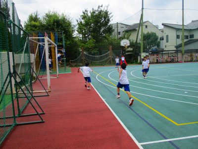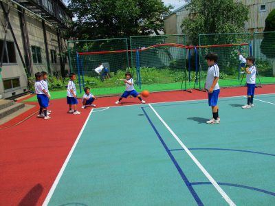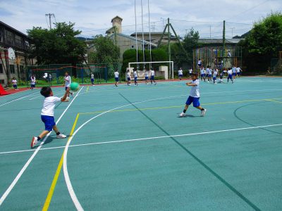 ドッジボールにハンドベース。太陽の光がまぶしく、暑い暑い中です。