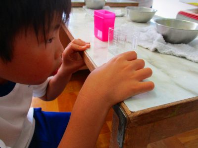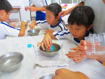 10mLのかさを体感するコースと、身近な入れ物からかさの単位を探すコースに分かれて、学習は進みました。