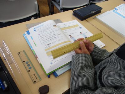 「cm」と「mm」。30cmものさしを使って、1cm刻みの読み方や、1mmずつ確認して、長さを調べる活動を進めています。