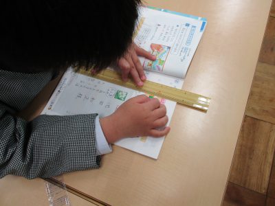 「4cm!」や「21cm」など、ものさしの端から指示された長さを指で押さえるところから、今日の算数がスタートしました。