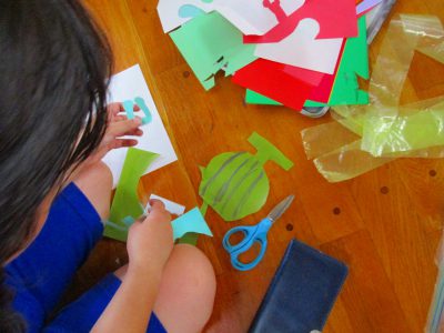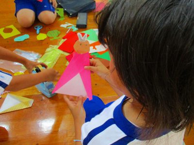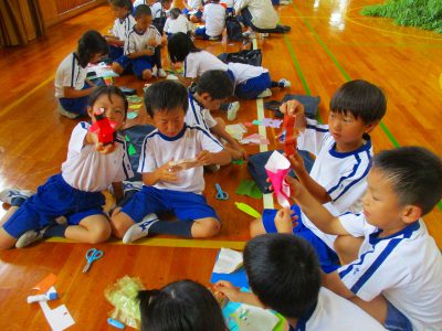 担任から、七夕ならではの飾りを数点紹介した後は、1年生とグループになって、“七夕かざり”作りの開始です。