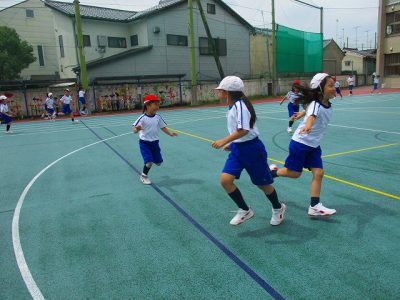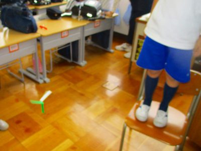 午後3時過ぎの校庭の風は少し横向きのため、軽い“折り紙たね”は、あおられる感じで、ひらひらは難しいようでした。