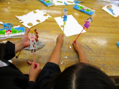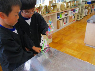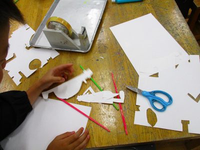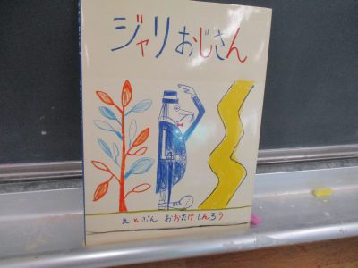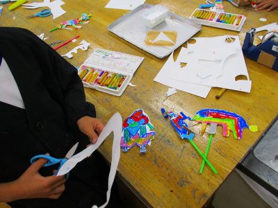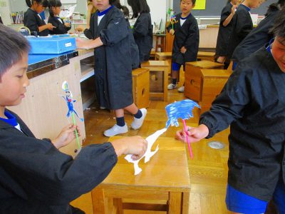 『ジャリおじさんのさんぽ道』というお話から、絵の具で散歩道を作って、ペープサートに表した登場人物にその道でお散歩してもらおうという題材です。