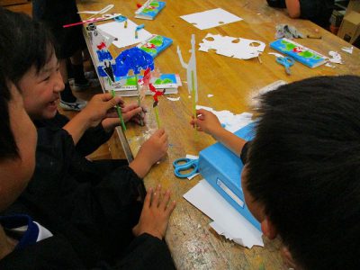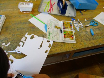 1年生の紙版画の原板作りで苦労した分、みんな“のりのり”で作り進めていました。
