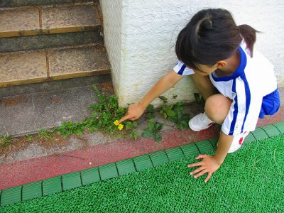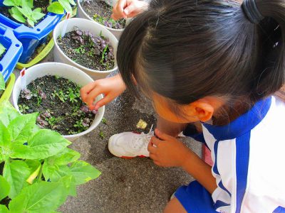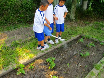 これまで、根っこが土に根付くのを待って、籾山先生と担任で水やりをしていたサツマイモでしたが、ようやく文教キッズの畑に根付いたようで、くっと茎を伸ばし始めました。