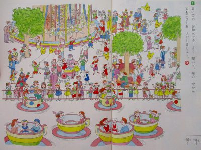 教科書にある遊園地の様子を元に、迷子の子1人を決めて、その子の特徴をみんなに伝え、居場所を見つけてもらう学習です。