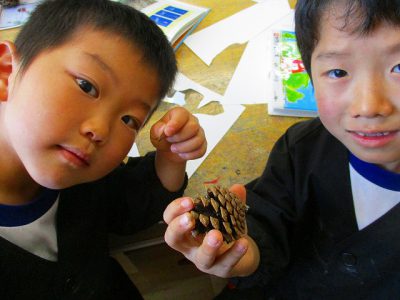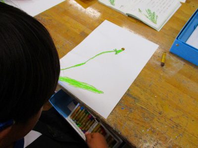こちらは、木の実やぺんぺん草、カタバミやココヤシの実など、場面に登場するものをどしどし描いていきます。