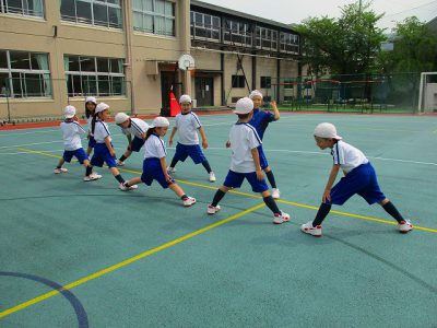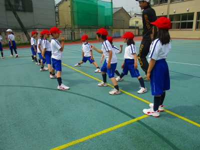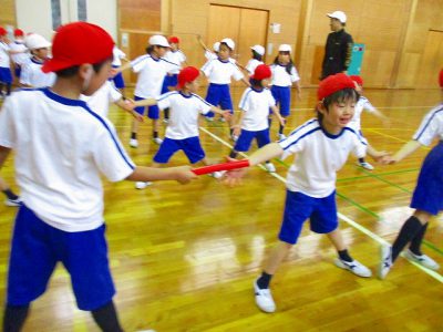 体育では、リレーの「バトン渡し」をいろいろな方法で繰り返し練習しています。