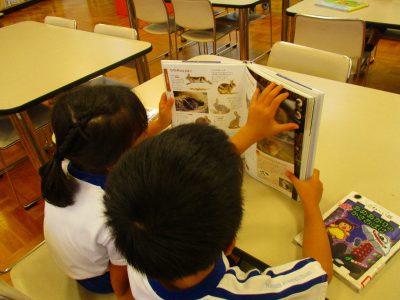 図鑑の棚から、「植物図鑑」「花図鑑」「動物図鑑」を選び、昨日触れ合った「テンジクネズミ」「ウサギ」、来週触れ合う「ヤギ」、生活科で育てている「あさがお」「ミニひまわり」を調べています。