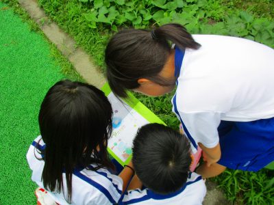 5校時の生活科は、2年生と校庭の探検に行きました。
