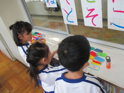 今日の朝休み、朝の準備を終えたお友達がみんなの分を貼ってくれて、カラフルなこいのぼりが完成しました!