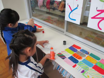 昨日の学級活動の時間に色を塗った鱗を貼り合わせます。