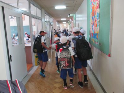 2時間目の学習の後、6年生の班長さんが1年生教室まで迎えに来てくれました。