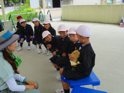いなりくんをやさしく見つめながら抱っこする子ども達。