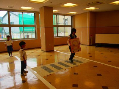 まず、危険な歩き方の絵を見ながら、どこが危険なのか、どうすれば安全に歩くことができるかを考えました。