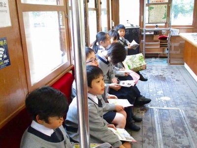 かつて街を走っていた市電の中で、担当の方から地区の歴史や地形の話を聞いたり、写真を見たり、また、地図も頂きました。