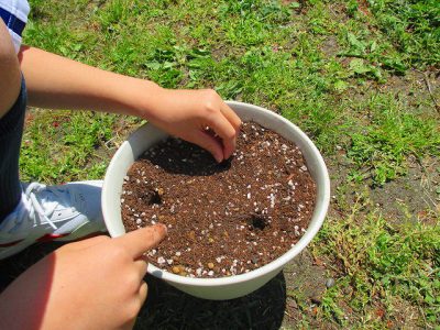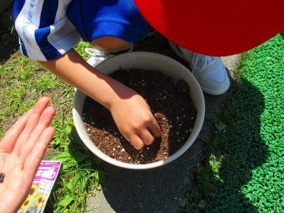 その後、植木鉢に土を入れて、小さなかわいい手でやさしく種をまきました。