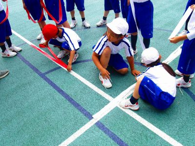 使ったしっぽ(ハチマキ)は、運動場のラインに合わせて、きれいに並べて返します。