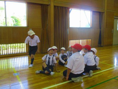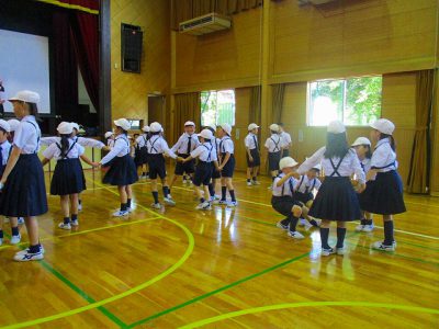 今日は、ちょっと難しい英語表現をした後、グループでの手遊びや「ハンカチ落とし」の英語版「とんぼと蚊」をしました。