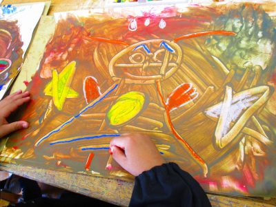 色の重なりを楽しみながら表現した画用紙の上に、クレパスで色を塗ったり、絵を描いたりしています。