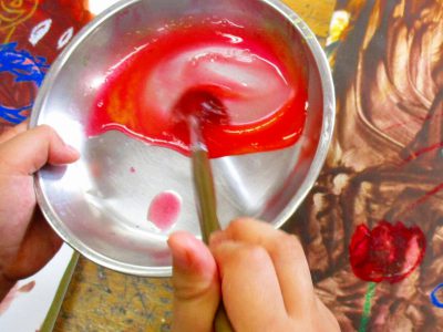 赤・青・黄色をそのまま使ったり、色を混ぜたりしながら、きれいな色を作っていました。