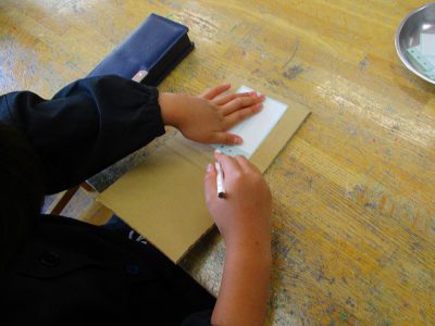 携帯電話の画面に見立てた白いタックシールに合わせて、考えながらダンボールを切ります。