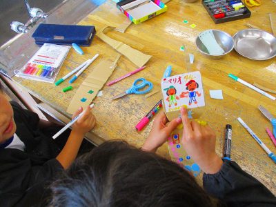 ダンボールを切った後、ポスカやカラーペン、タックシールを使って飾り付けです。