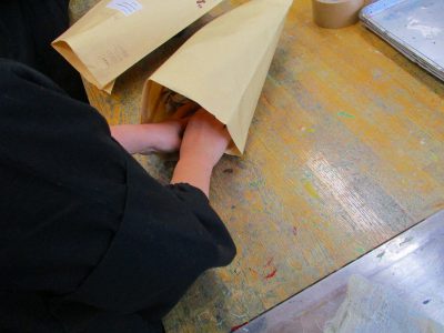 郵便に使われた封筒に、古新聞を詰めれば、マイピローの原型のできあがり。