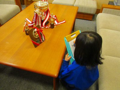 校長先生がトロフィを並べて待っていてくださいました。