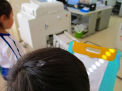 職員室にやってきた2年キッズは、電話の数を調べに回り、ロボットのような印刷機に見入っていました。