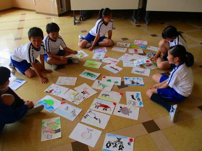 中央階段を上がった2階には、4年生が理科の時間に、はっちの杜で発見したことを「生き物マップ」にまとめています。