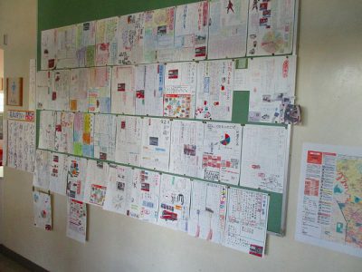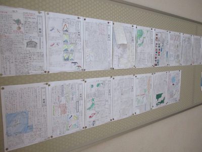 5年生教室前には、社会科で学習した日本の国土や気候、近隣諸国などについてまとめた新聞掲示があります。