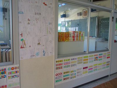 3年生の教室前は、算数科でコンパスを使って描いたパターンや、国語科の発展で考えた楽しいお店屋さんのことを書いたものが掲示されています。