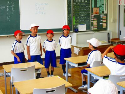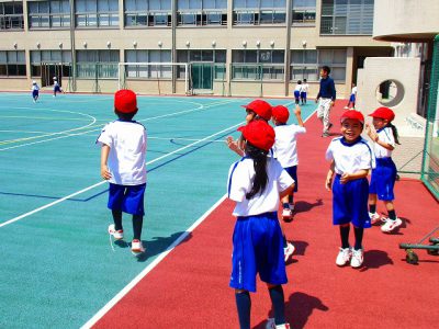 運動場に出る前に、日直さんがみんなにルールの確認をしています。