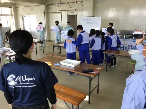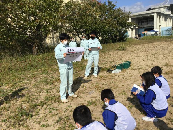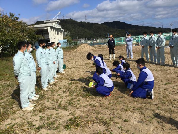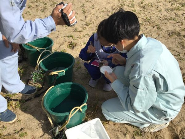 海洋高校の皆さんから説明を受けて、マイクロプラスチック回収スタート!