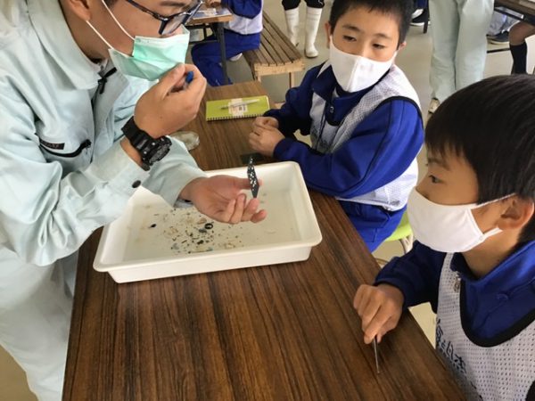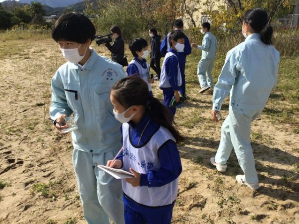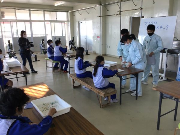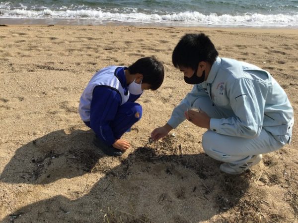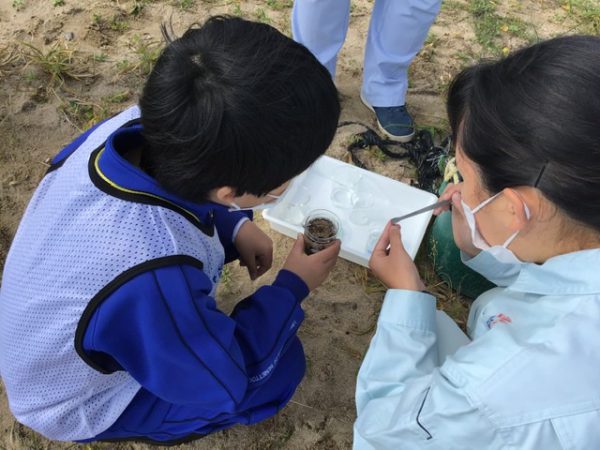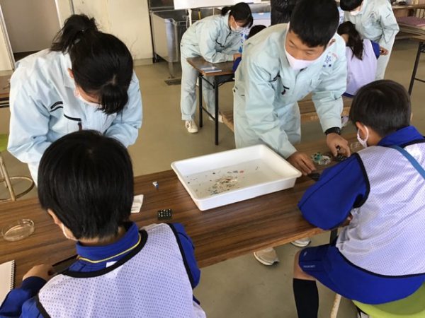 子ども達一人一人に高校生がついて、細かい説明をしてもらいながら一緒にマイクロプラスチックを回収しました。