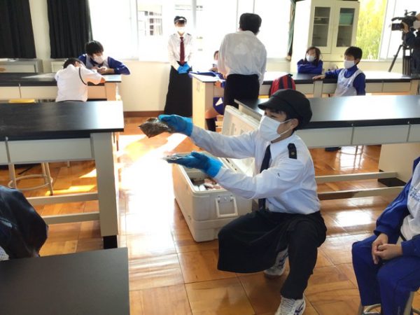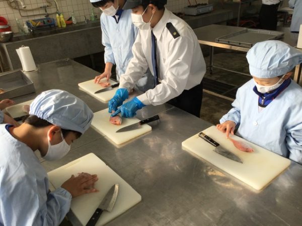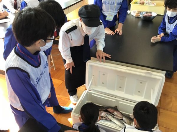 最初に、今日の調理に使う食材の説明を聞きます。実はこの食材、市場に出回らない魚類や穀類などを使用しています。調理にいろいろな工夫をするのがプロジェクトです!