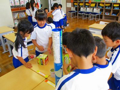 次の時間は、積み木を使いながら、「箱の形」「筒の形」「ボールの形」の特徴を、もう少しくわしく調べてみたいと思います。