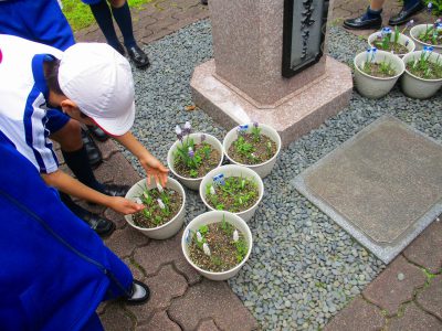 玄関の勢至丸様像の周りには、秋の終わりに植えた球根“ムスカリ”の花が咲いています。