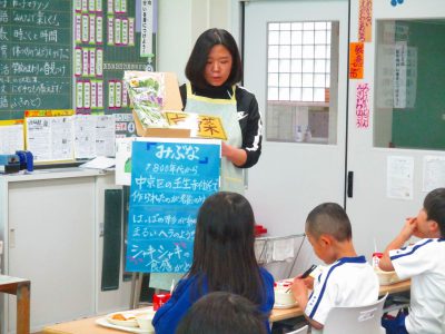 居相先生から、本日のメニュー“壬生菜のおかか和え”のお話を聞きました。